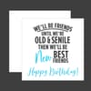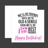 You are purchasing 1 x Funny Best Friend Birthday card. This card has a funny sentiment of 'Best Friends' and comes in either pink or blue accented font. The card is printed on 300gsm White Linen card and comes with an envelope. The card is 6" x 6" squared in size and has been left blank inside. POSTAGE: We aim to dispatch your purchase within 24 hours of payment (Monday to 12pm Friday) Colour Disclaimer: Although we do our best to make sure that the photo's we take display the colours of the products online accurately, the actual colours may vary slightly, this is due to differences in monitors and the device you use.