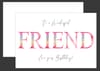 You are purchasing 1 x Happy Birthday to Wonderful Friend card. This elegant card has the word 'Friend' typed in a Blue or Pink Star font which is a lovely contrast to the white linen card. Please choose from the drop down menu if you would like the card in Blue or Pink Font. The card is printed on 300gsm White Linen card and comes with an envelope. The card is 6" x 6" squared in size and has been left blank inside. POSTAGE: We aim to dispatch your purchase within 24 hours of payment (Monday to 12pm Friday) Colour Disclaimer: Although we do our best to make sure that the photo's we take display the colours of the products online accurately, the actual colours may vary slightly, this is due to differences in monitors and the device you use.
